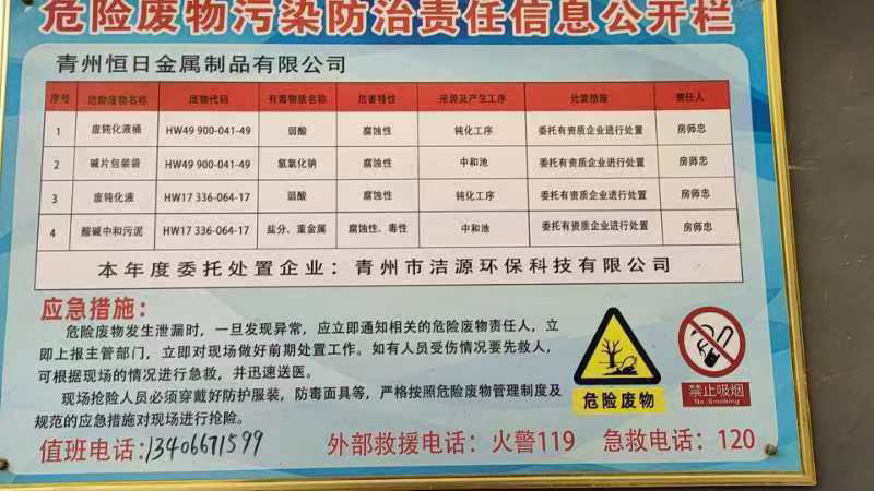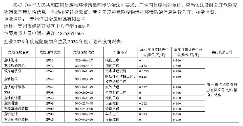 2024年青州恒日金屬制品有限公司危險廢物污染環境防治信息公示